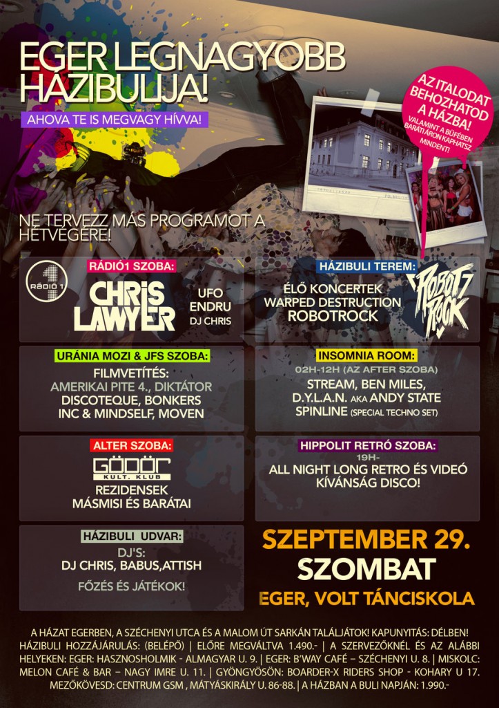 Azt, hogy igény egyébként lenne az aktívabb éjszakai életre, számos dolog támasztja alá, a nyári strand buli után például itt a következő nagyobb szabású rendezvény is, ezúttal „Eger legnagyobb házibulija” néven. A Tánciskola egykori épületében, szeptember 29-én megrendezendő eseményen öt szobában és egy kertben, összesen hat stílusirányzatban szórakozhatnak majd az érdeklődők. Erről Facebook oldalt ide kattintva, plakátot pedig alább lapozva találhatunk.