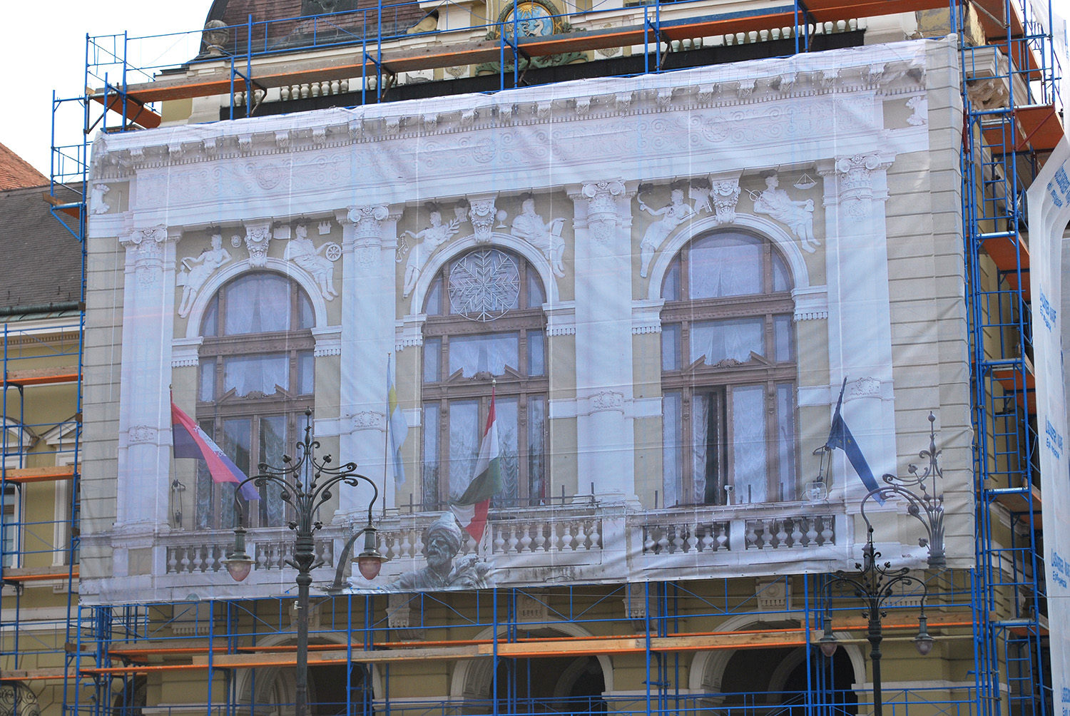 Akkor elkezdtük figyelni és persze kiderült, hogy nem az olasz egy ilyen hightech nép, hanem bevett gyakorlat ez számos más országban is, kis hazánkat kivéve – nálunk is biztosan számos esetben alkalmazták már a módszert, de tény, hogy nem gyakori jelenség. Egerben például soha nem találkoztunk eddig vele, pedig mindig gondoltunk rá, amikor mondjuk a megújuló Líceum mellett sétáltunk (valljuk, hogy az volt minden idők legcsúnyább állványozása Egerben, de legalább az eredmény szép lett, úgyhogy gyorsan el is felejtettük az előzményeket). Az ilyen hálók hiányát számon kérni persze nem lehet, felületesen, de ismerjük az ekkora anyagok nyomtatási költségeit és fordított esetben biztos, hogy arra a pár hónapra mi sem vernénk gyakran millióhoz közeli költségekbe magunkat miatta. Ámde úttörőként a Városháza felújításánál végre éltek a lehetőséggel és ha nem is az egész épületre, de legalább a főbejárat fölé a felújítás előtti fénykép került. Ráadásul színesben, nem is csak körvonalakkal, ami egy alternatív megoldás szokott még lenni ezekre az esetekre, úgyhogy mélységes tisztelet a kitalálója előtt!
