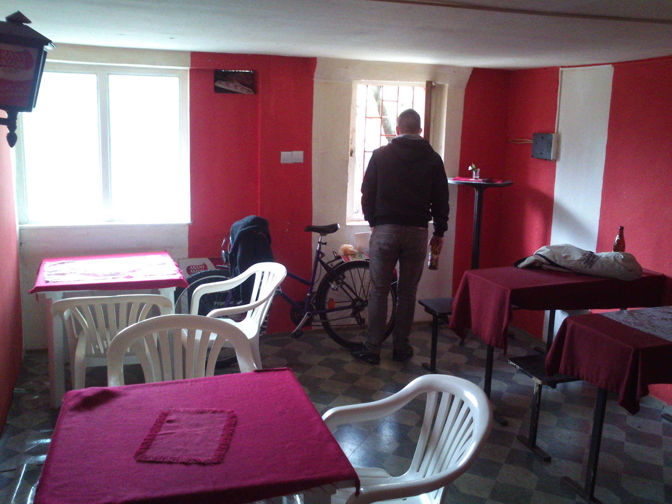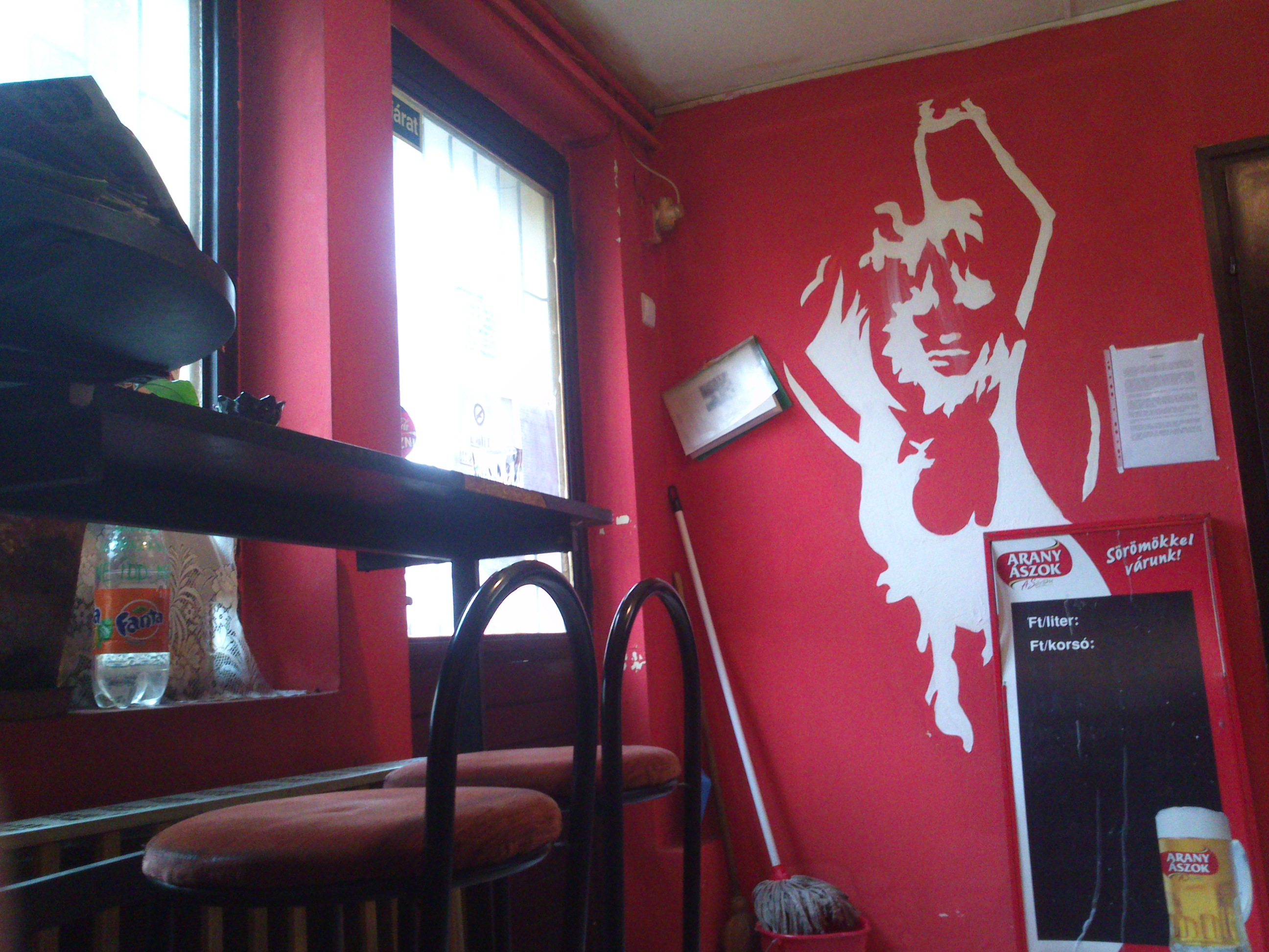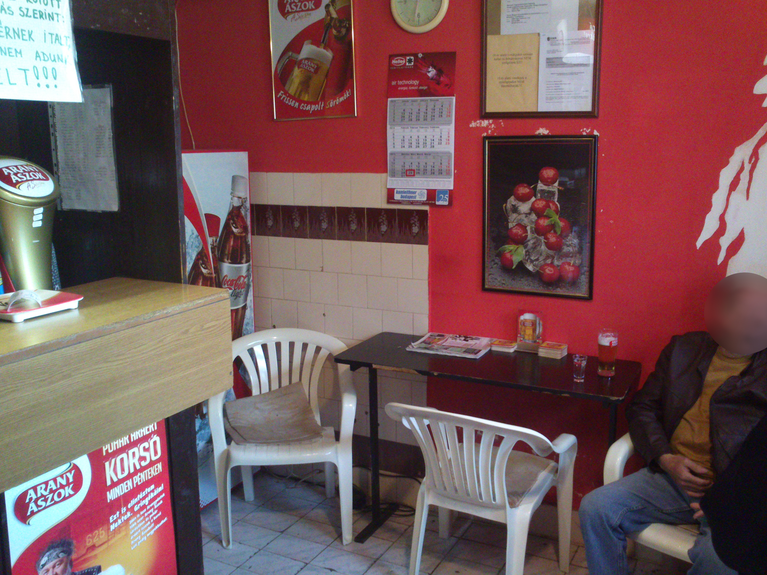 Belépés után, ami először szembetűnik az a merész színválasztás, cudar piros színt kaptak a falak, aminek bizonyára megvan az oka, a szemnek mindenesetre megváltás utána kijönni odabentről. Ugyancsak nem túl rózsás a helyzet a tisztaság és a berendezés terén, előbbi jelképes szinten létezik csak, utóbbi pedig évtizedekkel korábbról maradhatott meg a nagyérdeműnek. A kocsma két térből áll, az elsőbe mindösszesen két asztal fért, a hátsóba viszont már négy, úgyhogy összesen egész szép számú embert tudnak befogadni, kültéri terasz sajnos nincsen. Maga a Stop inkább a funkcióról szól, semmint az élményről, funkciójában viszont kedvező, üveges Kőbányainkat 240 forintért kaptuk meg. A kiszolgálás is kedves volt, illetve a vendégek is szimpatikusnak tűntek, egyikükkel még kézfogással is köszöntünk el, tehát családias hangulat járt át minket a vörös falak közt.