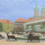 Valahol érthető, hogy ahogy távolodunk az első helyezettektől, úgy lesz egyre kevesebb vonzó elképzelés a tervekben, mindenesetre a harmadik 3. helyezettel sem értünk egyet több pontban. Eleve ők inkább egy kisvárosias irányban tervezték meg a belvárost, ami egyszerűen furán hat Egerben. Hiába lakunk ugyanis kevesen a városban és hiába a kisvárosias épületek a meghatározók, egy olyan környezetben, ahol a bazilika, minorita templom és Líceum töri meg az egységes képet, nem lehet anélkül elmenni ilyen irányba, hogy ez furán ne hasson. Mindenesetre a tervezők itt megpróbálták, egy kis szökőkutat raktak a jelenlegi változat helyére, kisebb épületre cserélték a Centrumot és két kerti pavilont raktak a Gárdonyi térre. Ami mondjuk tetszett, hogy sörözőt is terveztek a Centrum helyére, na az a része menő lett volna az ötletnek.