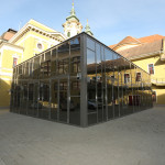 A belvárosi rehabilitáció keretében új közösségi tér épült a Városháza udvarára, ez egy kívülről teljesen üveg borítású rendezvénytermet jelent. Kissé csalódottak vagyunk a projektet illetően, mert amikor anno arról volt szó, hogy a Városháza udvarát kinyitják a lakók előtt, arra gondoltunk, hogy születik majd egy új tömbbelsői park. Nos nem így lett, a felújított udvar bár nagyon szépre sikerült, parkolóként funkcionál és a benne kialakított kis park is inkább csak a dolgozók pihenését szolgálja, semmint, hogy közparkként funkcionálna. Kár, pedig baromi hangulatos lenne. Na mindegy, az újonnan épült rendezvényterem is tetszetős lett, imádjuk a modern üveg megoldásokat, pláne, ha rajtuk régi épületek tükröződnek. Nem Egerben jöttek rá ennek a szépségére, a világ minden táján gyönyörű eredményekkel alkalmazzák ezt a megoldást, örülünk, ha kis lépésekkel ugyan, de Egerben is kacsingatnak az üveg borítás irányába. Ez ugye a második ilyen épületünk eddig a belvárosban, az első az Imola Kossuth utcai irodaháza mögötti pavilon, az is hasonlóan tetszetős egyébként. Az mondjuk kár, hogy ennyire óvatosak a modern épületekkel Egerben, mindkét üveg házat úgy eldugták, hogy az utcáról egyáltalán nem lehet látni őket, pedig talán érdemes lett volna megmutatni, hogy mink van.