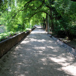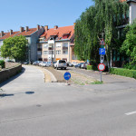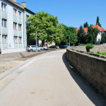 Az Egészségház út mellett nem nagy kaland a kerékpárút folytatása, az alap már adott volt ugyanis a patak melletti sétány miatt. Elég szép díszletben tekerhetünk majd, a szakasz Kossuth Lajos felé eső oldala ráadásul még árnyékos is, hát valahogy így néz ki egy ideális kerékpárút. Bonyodalmat három pont okoz a területen, stílusosan az elején, közepén és végén vannak ezek. A két szélen az összekapcsolást nehéz megoldani, az Érsekkert irányába az eltolt irányok miatt, a Dobó tér felé pedig a szűk folytatás miatt. A túloldalon ugye járdaként folytatódik itt a nemrégiben felújított út, ehhez csak úgy lehet hozzákapcsolni a most készülő részt, hogy azt is járdaként fejezzük be. Márpedig az nagyon kínos, ha egy kerékpárút hálózat akár egyetlen pontján is le kell szállni a bicikliről, bízunk benne, hogy találtak erre jobb megoldást is, kíváncsiak leszünk. A középső probléma a Gólya utcához átvezető híd, az ugye lépcsőkkel érkezik meg az Egészségház utcai partra, ezt egy szolid kanyarral kerülték ki a tervezők.