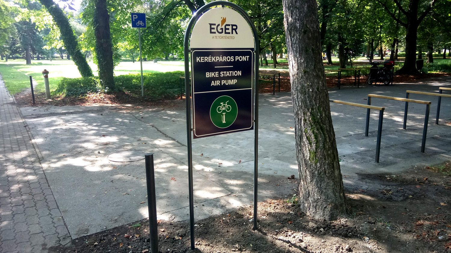 Az érsekkerti kerékpáros pont egyébként nagyon példásan kezdi kinőni magát. Az árnyas támaszokhoz ingyenes (!) mosdó és most már pumpa is tartozik. Bár eredetileg nem erre volt szánva a hely, ha kitennének egy asztalt és/vagy padot is hozzá, akkor a várost átszelő kerékpárút-hálózat egyik pihenőállomása is lehetne. És ha már nagyon elkalandoztunk a pihenőhely irányában, akkor még egy ivócsapot tudnánk maximum elképzelni, amihez meg éppen adva van a támaszok mellett egy tűzcsap… De ez csak fantázia, a tároló már így is egy borzasztóan jó hely Egerben. Annyi szépséghibával, hogy egészen érthetetlen módon, sokan még mindig inkább a patakhíd korlátjához kötik a kétkerekűjüket. Süti a nap, rosszul néz ki, de 5 lépéssel közelebb van onnan a fürdő bejárata. Bár a dologban leginkább a Termálfürdő a hibás, amiért hagyja.