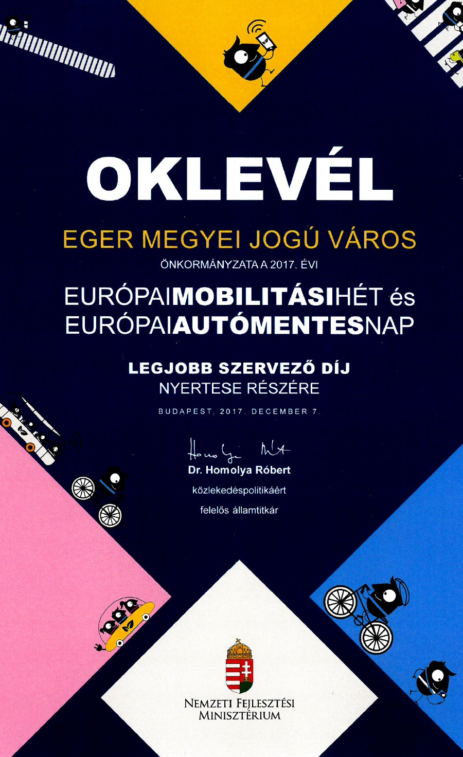Az Európai Mobilitási Hét a napokban, a fővárosban tartott kampányértékelő, záró konferenciáján és díjátadó ünnepségén Eger Önkormányzatát a „Legjobb szervező” – díjjal ismerték el. Az oklevélhez járt egy kerékpár is, melyet – a korábbi években elnyert bringákkal együtt – a Polgármesteri Hivatal dolgozói használnak napi munkájuk során.