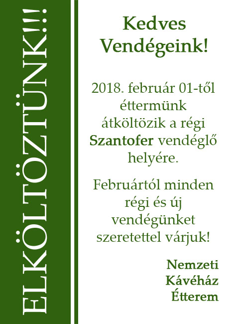 Ahogy az bizonyára sokak számára ismert, tavaly szeptemberben munkaerőhiányra hivatkozva végleg bezárta kapuit egy nagynevű egri étterem, a Szantofer. Az épületre ekkor felkerült a szomorú hangulatú eladó/kiadó tábla, ám mostanra már meg is van az új üzemeltető: február 1-től a Nemzeti Kávéház Étterem költözik a házba.