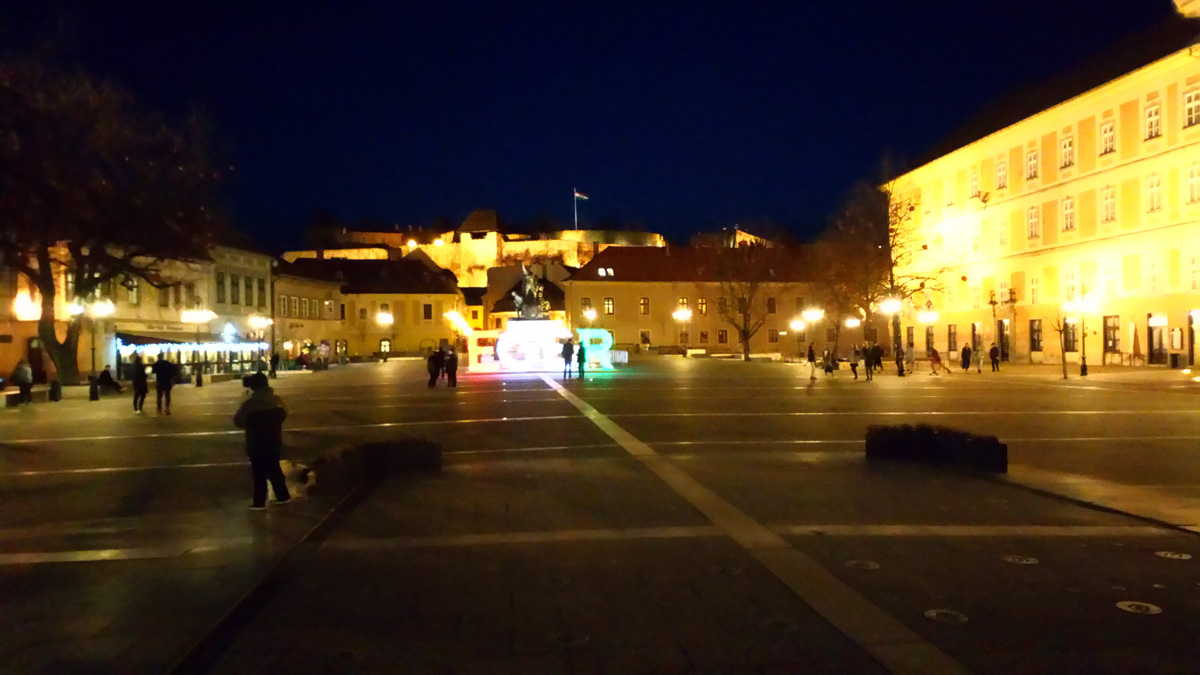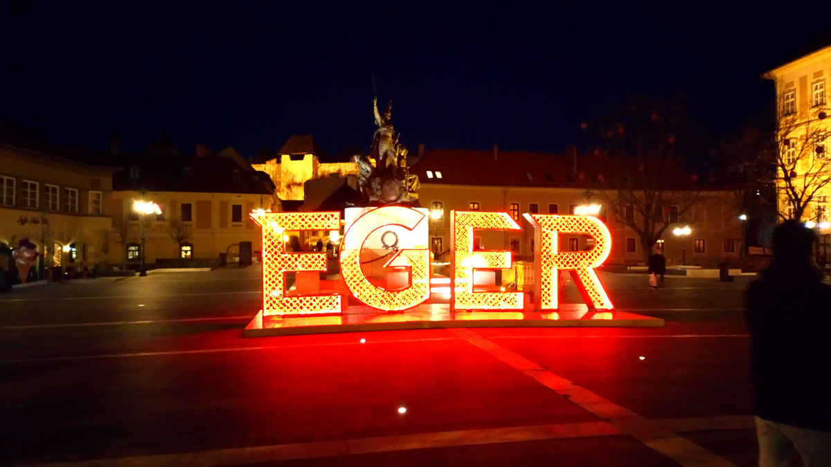 A felirat ugyanis útra kelt és az új helyét valamilyen hátborzongató ötlettől vezérelve a főtér közepén, a Dobó szobor előtt kapta meg. És hogy teljes legyen a boldogság, már színesen világít is az attrakció, mégpedig a nemzeti ünnephez méltó módon, pirosan, fehéren és zölden. Sajnos zenélni még nem zenél, de enélkül sincs az a pár ezer lelkes, jellegtelen mezőváros, amelyik ne irigyelné ezt meg tőlünk… A felirat, mivel átlátszó, nappal rosszul mutat a részletgazdag háttér előtt, este pedig gagyivá teszi a környezetét. Mindezt Magyarország egyik legtöbbet fotózott és legjellegzetesebb városképének a kellős közepén. Pár éve felújították a teret, lepucoltak róla mindent, hogy az összes figyelem a festői környezetre irányuljon, gyönyörűen meg is világították ezt a festői környezetet, majd most beraktunk egy színesen világító feliratot ennek a gyönyörűen megkomponált jelenetnek a közepére.
