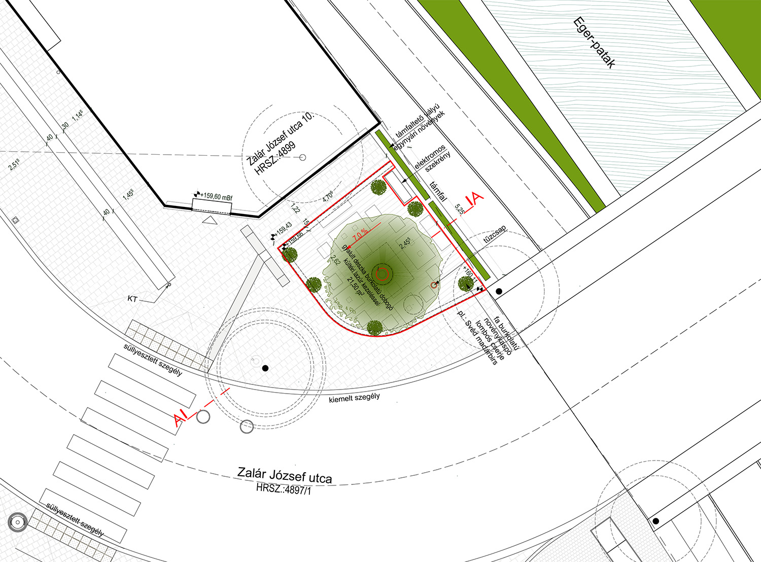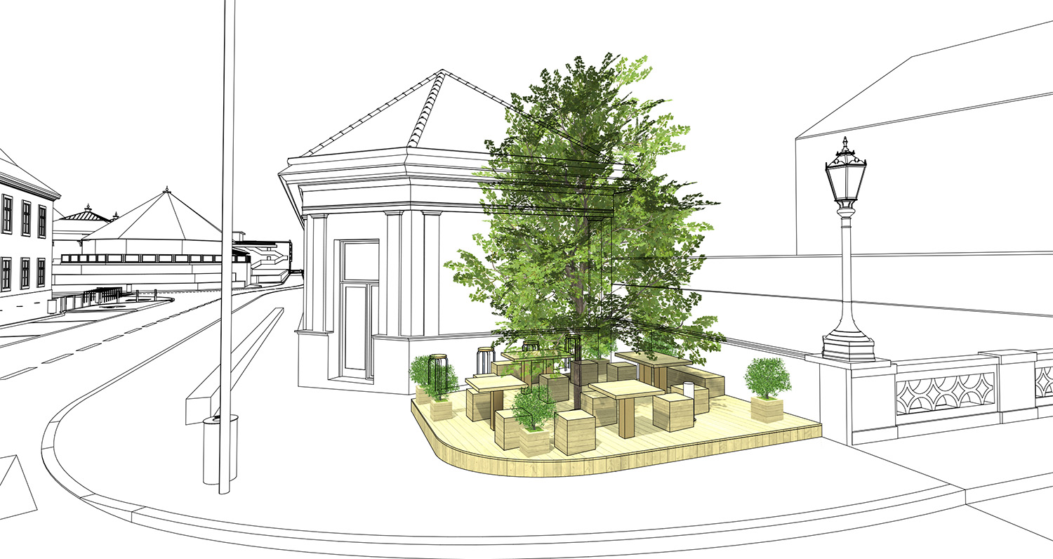 A kávézót üzemeltető cég azzal a kérelemmel fordult Eger önkormányzatához, hogy az üzlet előtti közterületen vendéglátó teraszt alakíthassanak ki. A hivatal szakirodái a burkolt felületen közlekedési okokból nem látták megvalósíthatónak az ötletet, a szomszédos zöldfelület használatát viszont támogatták, amennyiben megfelelő tervdokumentáció készül. Az elkészült tervek szerint a híd és az épület közötti mintegy 20 négyzetméteres zöldterületen gyalult, lazúrozott deszkaburkolatú dobogó kerülne kialakításra, rajta négy faasztallal, tizenkét fa ülőbútorral és hat növénykaspóval.